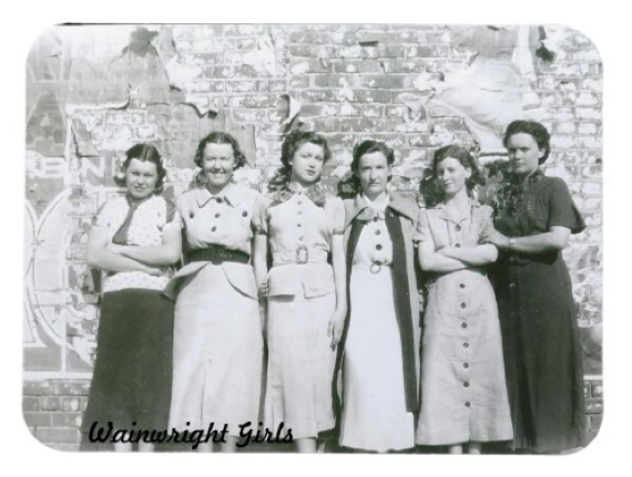 A few years ago, one of my cousins sent me an old family photo. His mother was the only person he recognized. I’m guessing from these dresses, this picture was taken about 1938. The torn bulletin banner worn off of the brink wall behind the stylish young women has long been covered with a newer, more famous Coca Cola billboard. Their faces haunted me. I struggled with, as I quite often do with old family pictures, “Why didn’t somebody write the names on the back of this photo?” I named them the “Wainwright Girls!”
